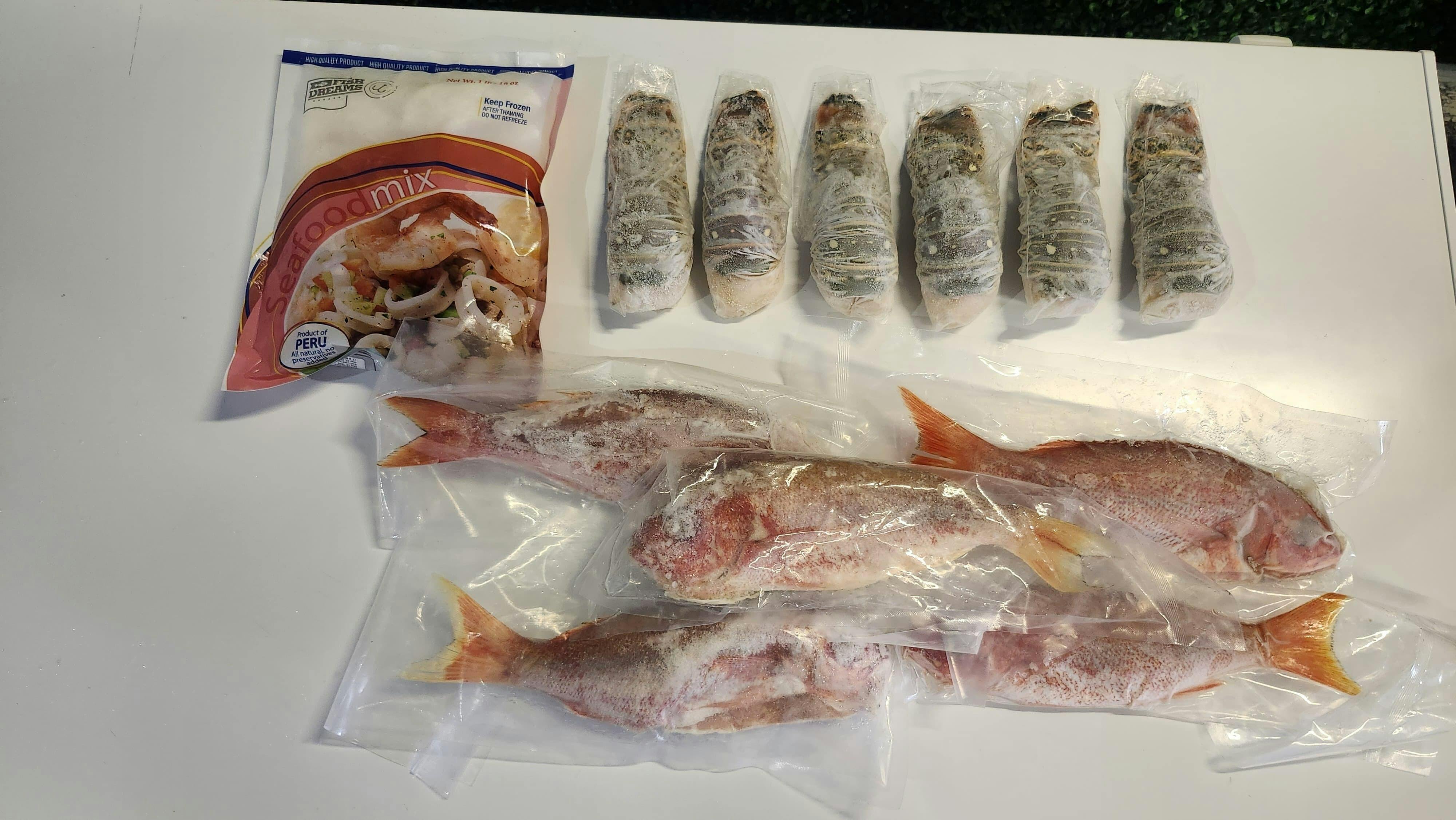 Family Combo Includes: 6 Caribbean lobster tails, 5 whole snapper (¾–1 lb each) & 1 seafood mix bag